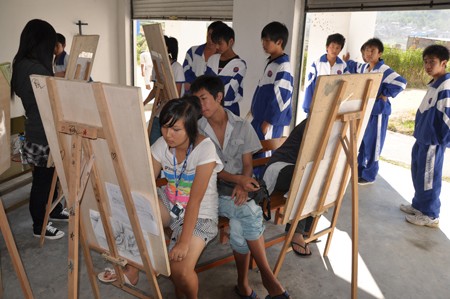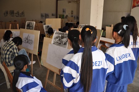 该28名同学是临翔区二中美术兴趣小组的成员,据美术老师王朝洲介绍,此行的目的在于让同学们借鉴学习,找出自身的不足。28名学生仔细地观看了展览在画室的作品,并同在画室作画的我校美术专业学生进行了交流。李秋月同学说:学姐学长画得很棒,我要向他们看齐。唐永心同学说:感谢学姐学长的鼓励,我以后要多画,不怕画错。